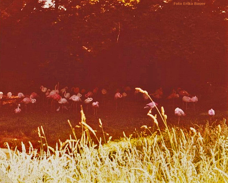 Flamingos im Zoologischen Garten Wuppertal im Sommer 1977.
