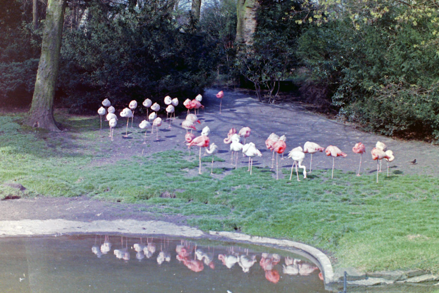 Flamingos im Zoologischen Garten Wuppertal im April 1977.