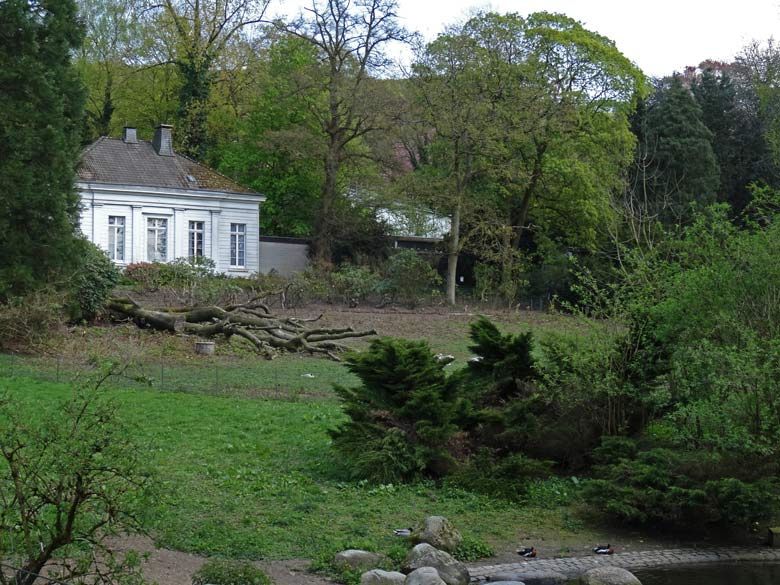 Gelagerte Baumstämme neben dem Teich für Hawaiigänse, Kaisergänse und Streifengänse am 1. Mai 2016 im Wuppertaler Zoo.