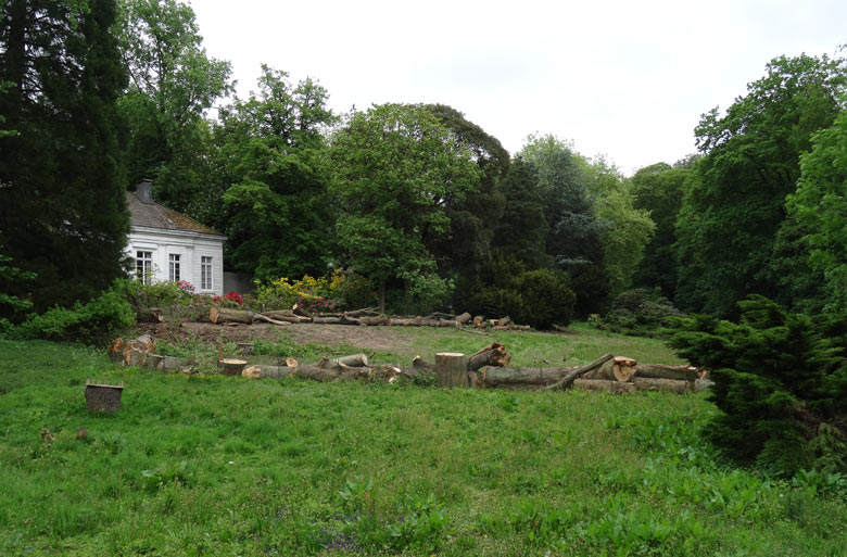 Schon seit Wochen wundern sich einige Zoogäste über die an den Teichen mit Wassergeflügel gelagerten Baumteile. Nach so manchen Baumfällungen wurden die Stämme zerteilt und an zwei Stellen im Zoo gelagert: Neben dem Teich mit den Hawaiigänsen, Kaisergänsen und Streifengänsen sowie oberhalb des großen Teichs in der Nähe der Freianlage für die Orang-Utans.