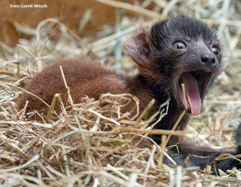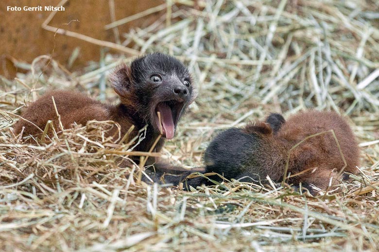 Die beiden am 11. Mai 2016 geborenen Jungtiere bei den Roten Varis am 28. Mai 2016 im Affenhaus im Zoologischen Garten der Stadt Wuppertal.