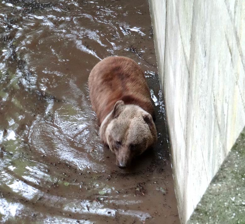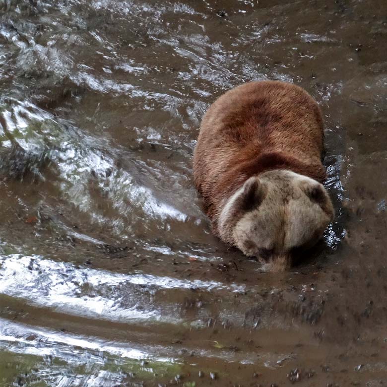 Braunbärin Brenda ließ sich bei ihren gewohnten Wanderungen über die Braunbärenanlage am Dienstag, dem 31. Mai 2016, durch das Wasser nicht beeinflussen und suchte ihren Weg mitten durch das nasse Element. Mit der Zeit schien sie Gefallen an dem feuchten Untergrund zu finden und tauchte sogar mehrmals mit der Schnauze unter Wasser und inspizierte den Erdboden unter Wasser.