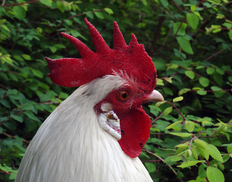 Als "Freigänger" dürfen sich die Bergischen Krüper ungehindert auch außerhalb ihrer Anlage bewegen. Am Dienstag, den 31. Mai 2016 konnten Zoobesucher/innen den Bergischen Krüper aus der Nähe im satten Grün der Bepflanzung an der Elefantenanlage betrachten.