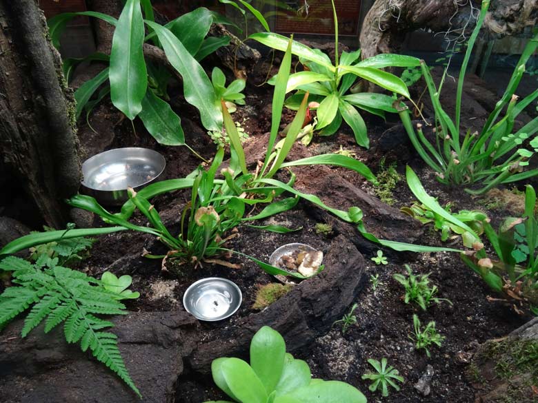 Im mittleren Nistkasten, vor der Gehege-Rückwand, kümmert sich ein Jägerliest um den Nachwuchs. Dieser Vorgang spielt sich im Nistkasten ab und kann von Zoogästen nur geahnt werden. Drei Küken sind wohl aus den Eiern geschlüpft.