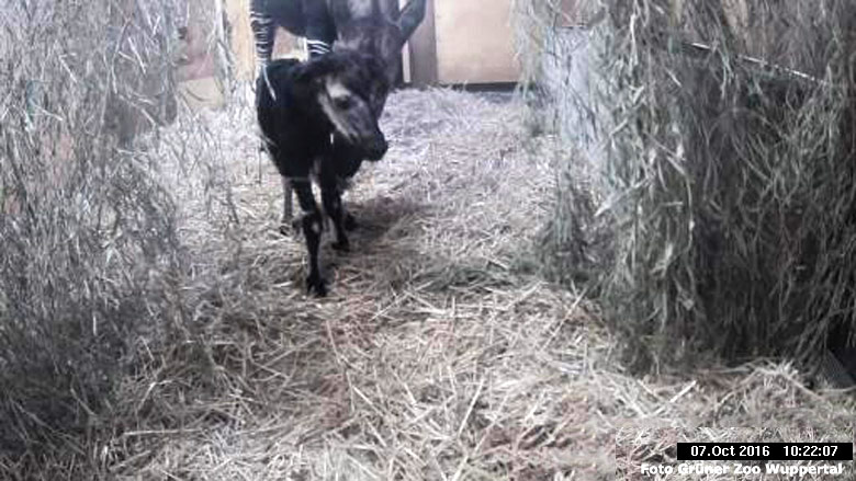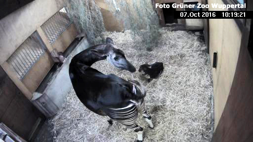 Die Geburt erfolgte völlig entspannt im Stall unserer Okapis. Mit großem Stolz und einer gehörigen Portion Freude beobachten wir seitdem, auf installierten Kameras, wie sich das Kleine entwickelt. Nach 30 Minuten stand das Jungtier bereits auf eigenen Beinen und hat nach einer Stunde angefangen Milch zu trinken.