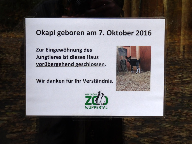 Aushang am Okapi-Haus am 29. Oktober 2016 im Grünen Zoo Wuppertal.