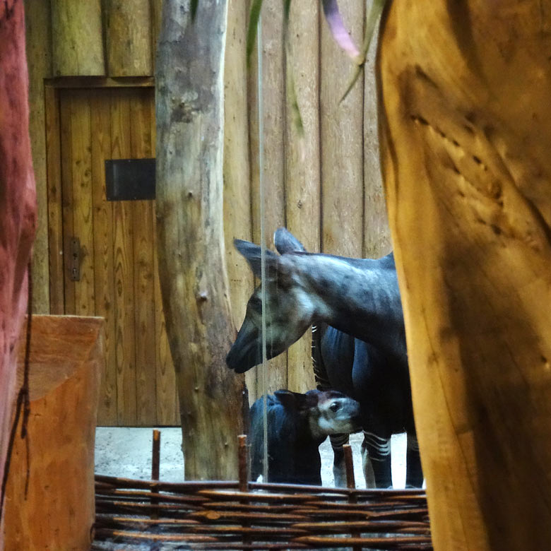 Mit viel Glück konnten Zoobesucher/innen am Sonntag, dem 30. Oktober 2016, erste Blicke auf das Okapi-Jungtier ELANI mit der Okapi-Mutter LOMELA werfen.