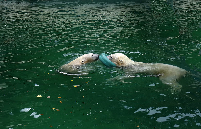 Eisbärin ANORI im Wasser und Eisbär LUKA mit Rohr am 30. Oktober 2016 im Grünen Zoo Wuppertal.