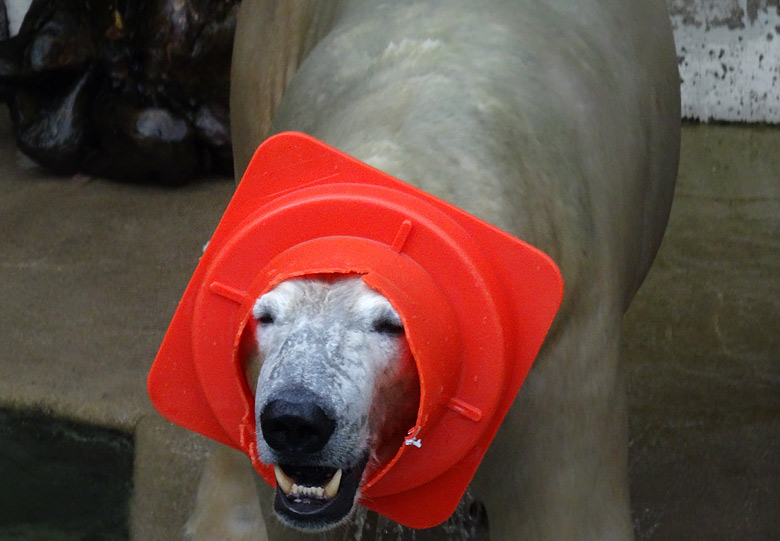 Eisbär LUKA am 2. Oktober 2016 mit speziellem selbstkreierten Kopfschmuck im Zoologischen Garten Wuppertal.