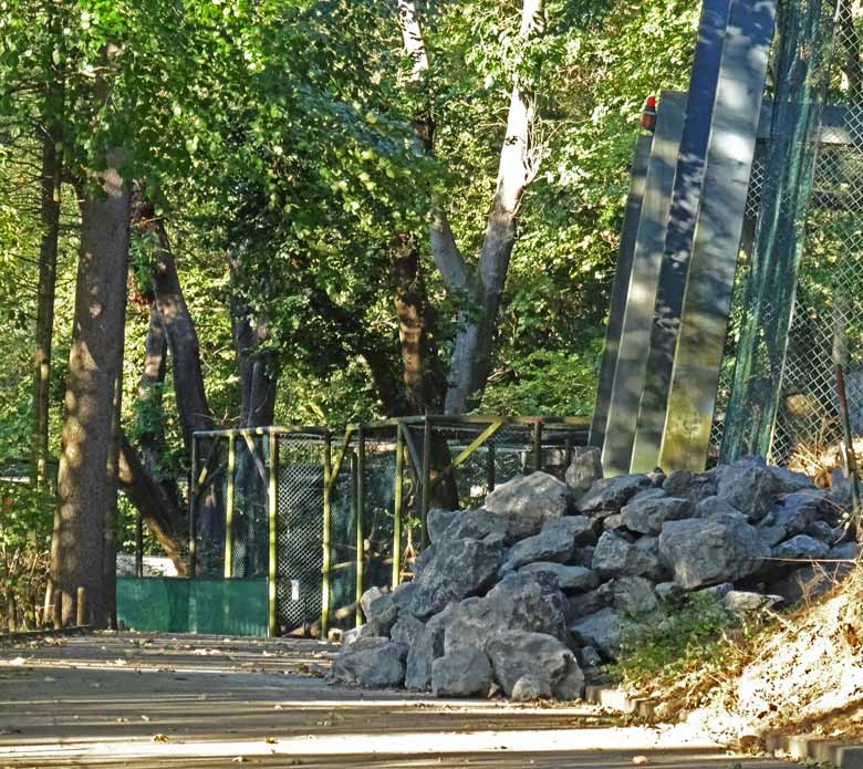Der Blick vorbei an den Absperr-Wänden fiel auf an diesem Tag neu angelieferte größere Steine für die Neugestaltung der neuen geplanten Schneeleoparden-Anlage.