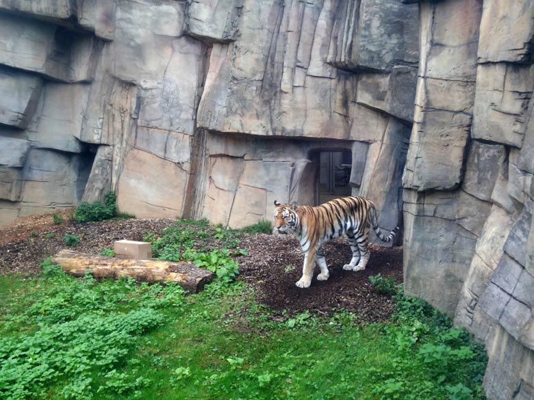 Sibirischer Tiger-Kater "Wassja" neben herbstlich gefärbtem Laub am 26. Oktober 2016 auf der Anlage der Sibirischen Tiger im Tigertal im Grünen Zoo Wuppertal.