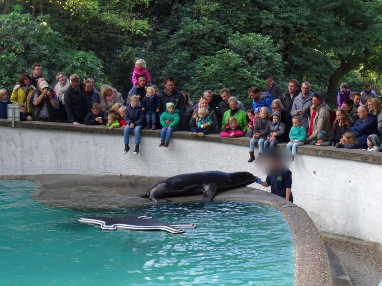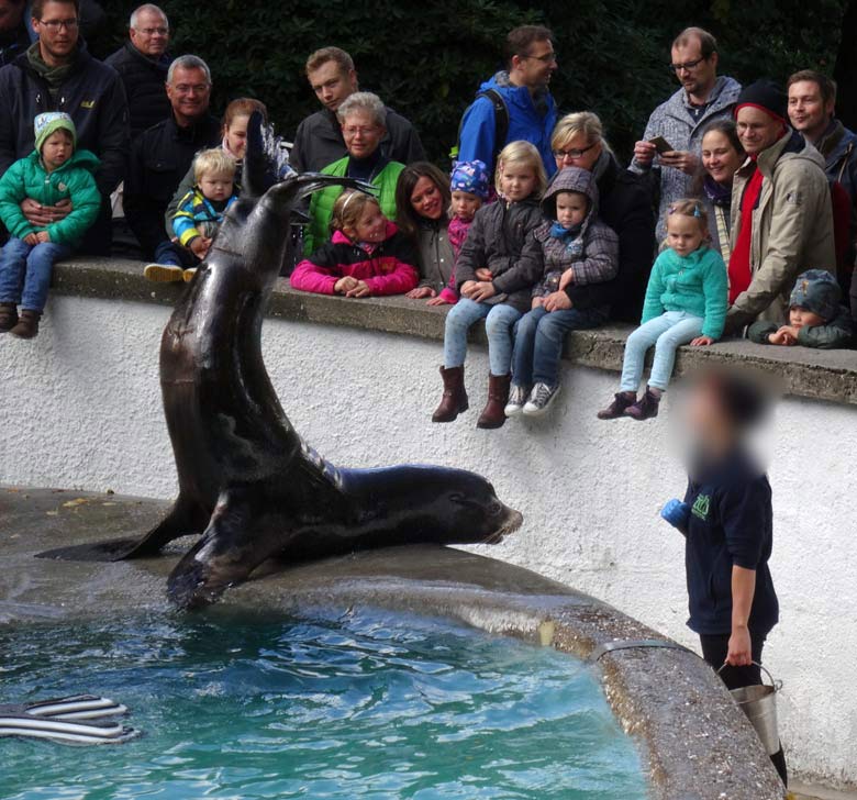Kalifornischer Seelöwenbulle MYLO am 8. Oktober 2016 bei der kommentierten Fütterung im Zoologischen Garten Wuppertal.