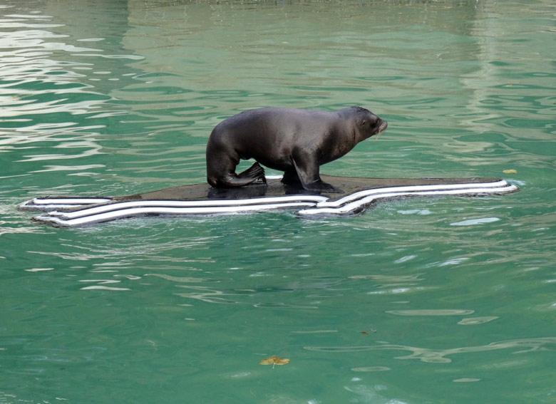 Während eine Tierpflegerin mit den Kalifornischen Seelöwen-Weibchen "Pebbles" und "Kuba" eine Trainingseinheit absolvierte, saß das Kalifornische Seelöwen-Jungtier "Davy Jones" auf einem Kunststoff-Brett mit Robben-Umriss und zeigte sich den Zoogästen in beeindruckenden Posen.