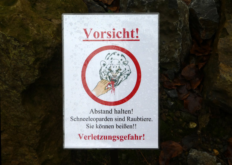 Warnschild vor beißenden Schneeleoparden vor der Außenanlage der Schneeleoparden im Zoo Wuppertal.