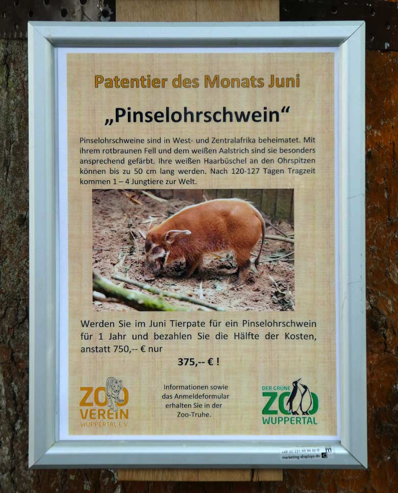 Als neues Angebot im Rahmen der Aktion "Patentier des Monats" werden im Grünen Zoo Wuppertal im Juni 2018 Patenschaften für ein Pinselohrschwein offeriert. Wer Tierpate für ein Pinselohrschwein für ein Jahr wird, bezahlt anstatt 750 Euro im Juni 2018 nur 375 Euro.