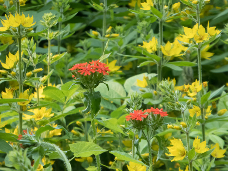 Am Weg, der am Insektengarten vorbeiführt, springt den Zoobesucher/innen im Zoologischen Garten der Stadt Wuppertal die Brennende Liebe (Lychnis chalcedonica) im gelben Blutenmeer derzeit regelrecht ins Auge.