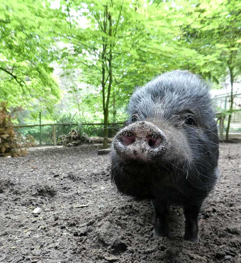 Neugierig kam das Mini-Schwein am Sonntag, dem 3. Juni 2018, in der Außenanlage im Zoologischen Garten der Stadt Wuppertal auf die Zoobesucher/innen zu und schnüffelte interessiert.