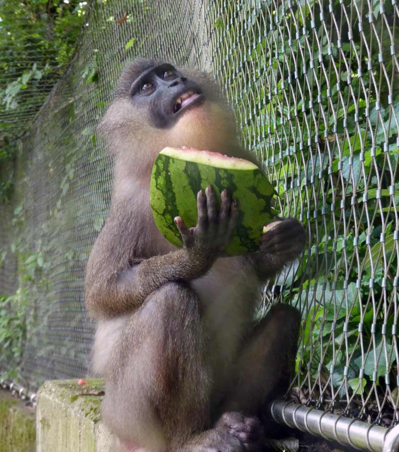 Ein Drill-Weibchen erfrischte sich am Samstag, dem 2. Juni 2018, mit einem Stück Melone auf der Außenanlage im Zoologischen Garten der Stadt Wuppertal. Damit die beiden anderen Drille ihr das Stück Melone nicht streitig machen konnten, verzog sich das Drill-Weibchen auf die Mauer am Zaun der Außenanlage.