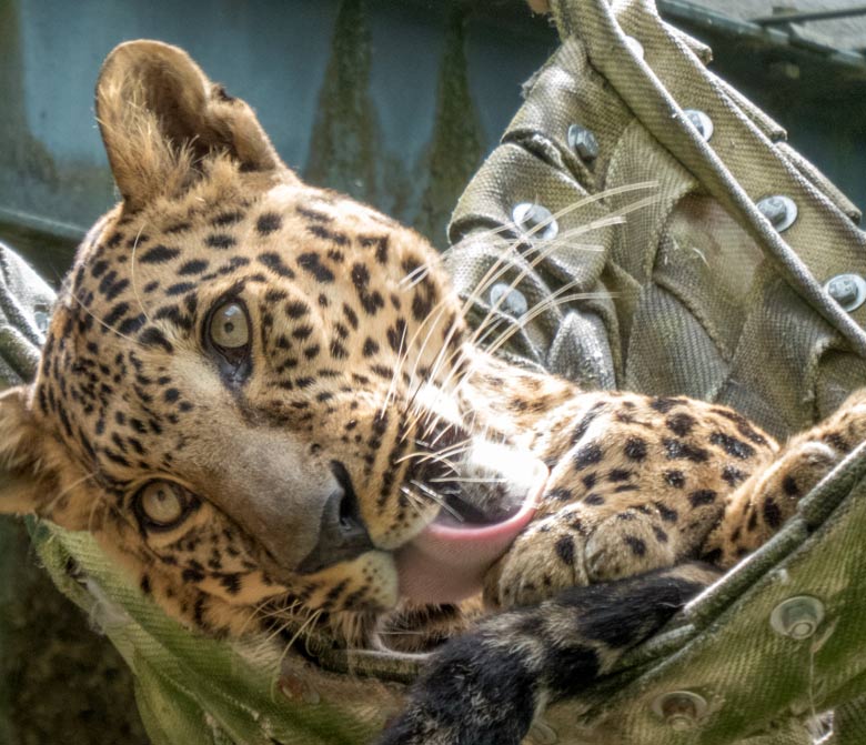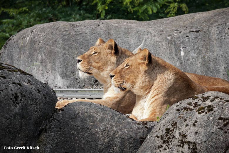 Afrikanische Löwen-Katzen am 3. Juni 2018 auf dem Dach der Besucherhöhle im Wuppertaler Zoo.
