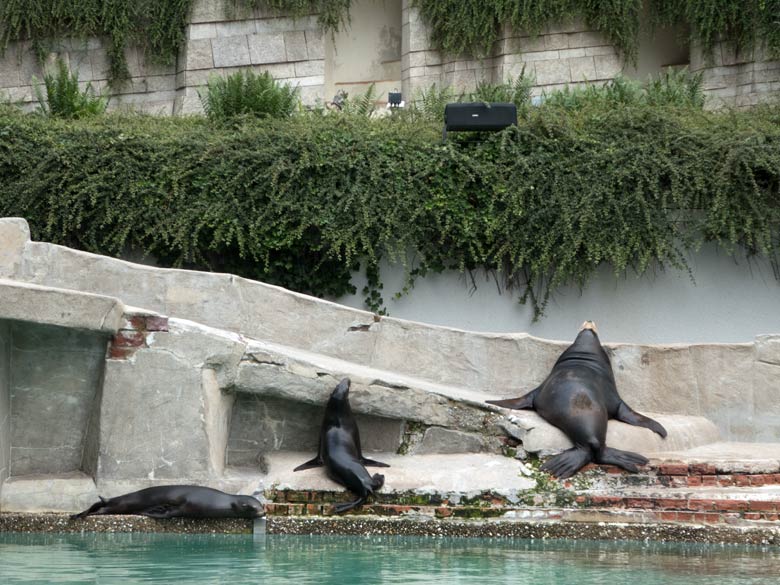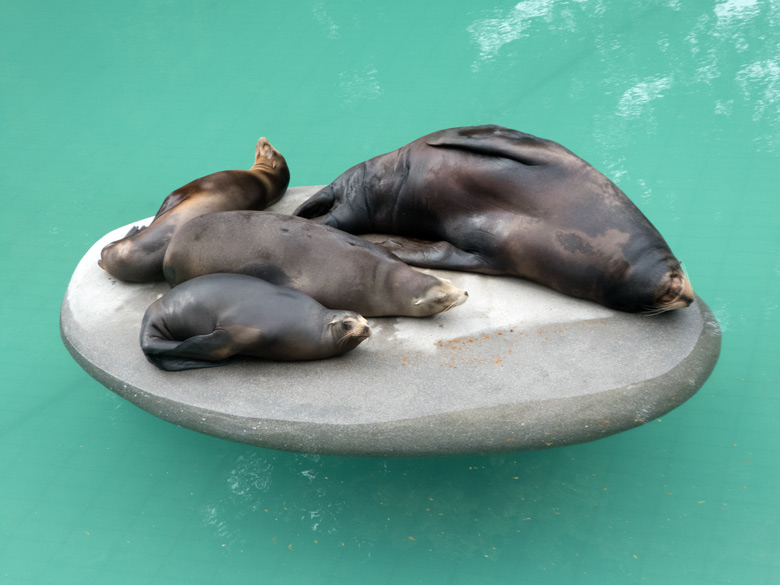 Vier Kalifornische Seelöwen am 6. Juni 2018 im Grünen Zoo Wuppertal.