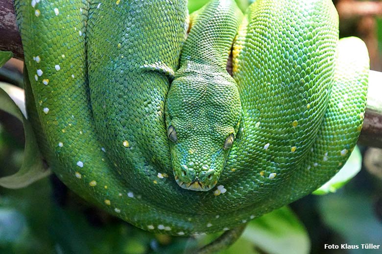 Grüner Baumpython am 28. Oktober 2019 im Terrarium im Grünen Zoo Wuppertal.