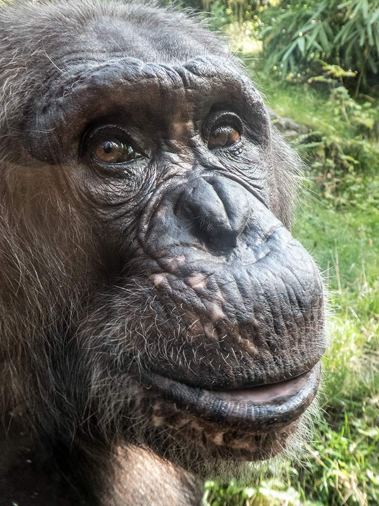 Pressefoto: Schimpanse EPULU im Jahr 2018 auf der Außenanlage im Grünen Zoo Wuppertal.