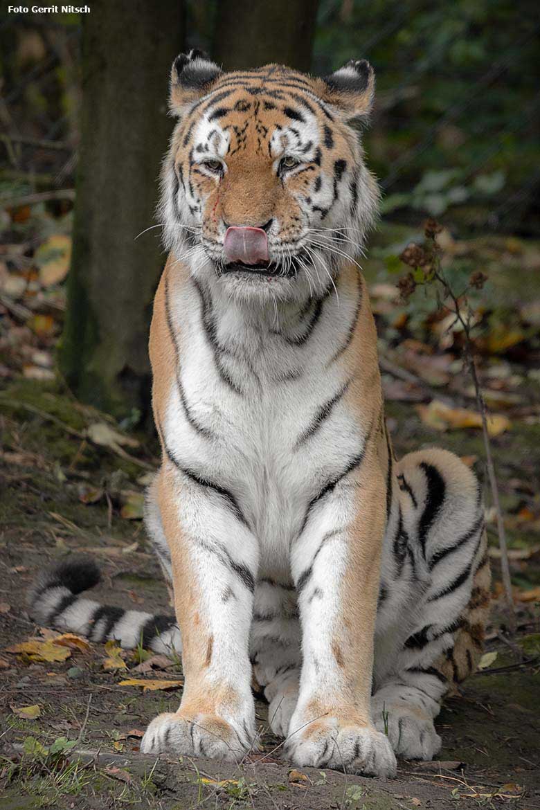 Sibirischer Tiger-Kater WASSJA mit etwas Blut auf der rechten Nasenseite am 5. Oktober 2019 auf der Außenanlage im Tiger-Tal im Zoo Wuppertal.