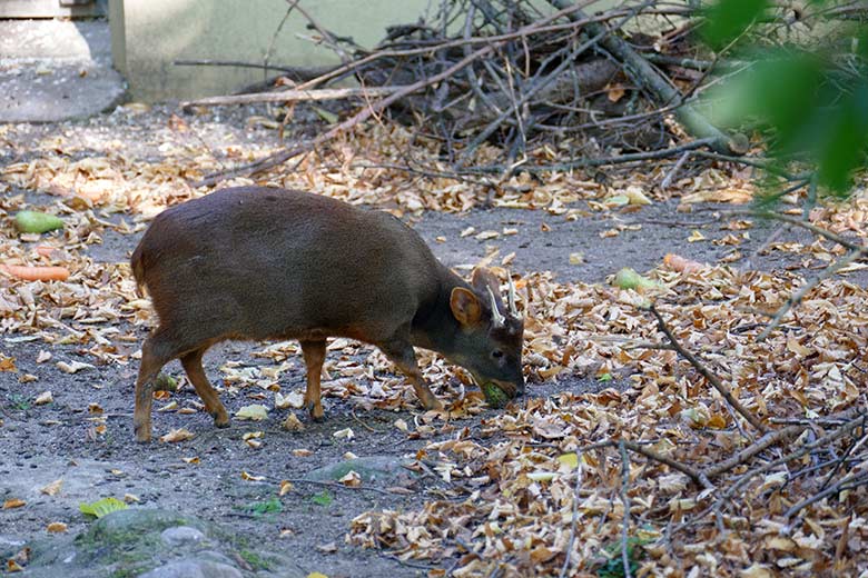 Rentier mit bereits vor vier Wochen abgefegten Geweih am 27. September 2020 auf der Außenanlage im Wuppertaler Zoo.
