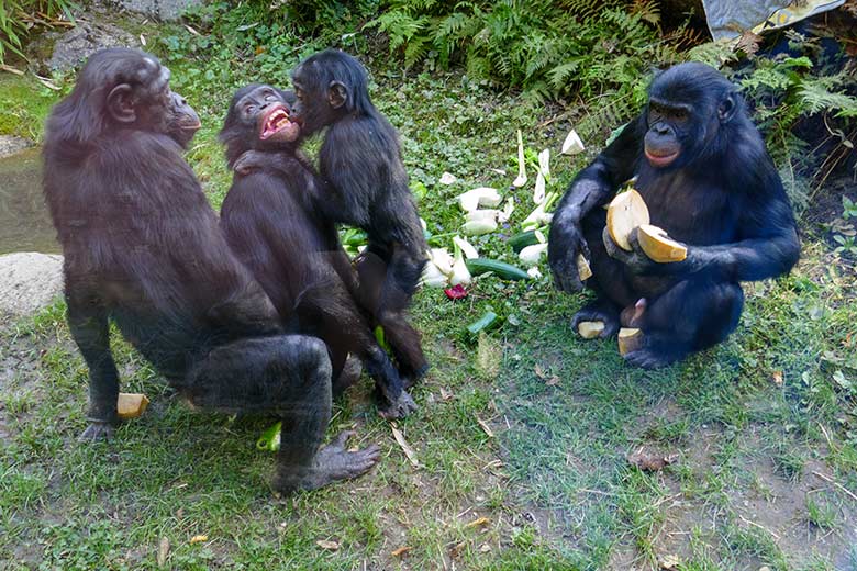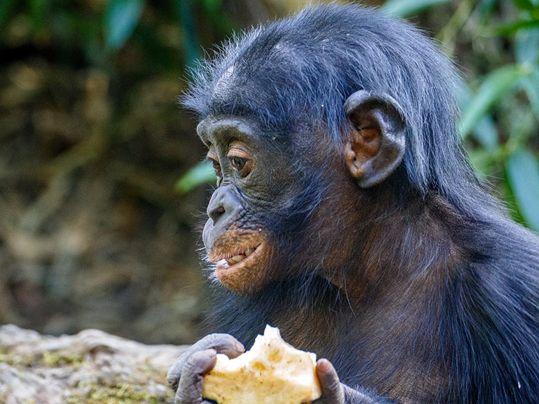 Männlicher Bonobo am 6. September 2020 auf der Außenanlage am Menschenaffen-Haus im Zoo Wuppertal.