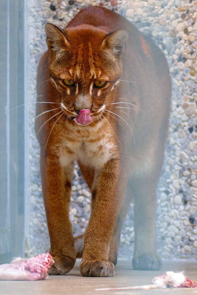 Zoobesucher/innen konnten daher am Montag, dem 7. September 2020, beobachten, wie eine Asiatische Goldkatze die Futter-Portion von einem Teil-Stück eines weißen Hasen lange Zeit betrachtete, leckte und im Gehege umher trug, ehe die Asiatische Goldkatze das eigentliche Fressen anfing.