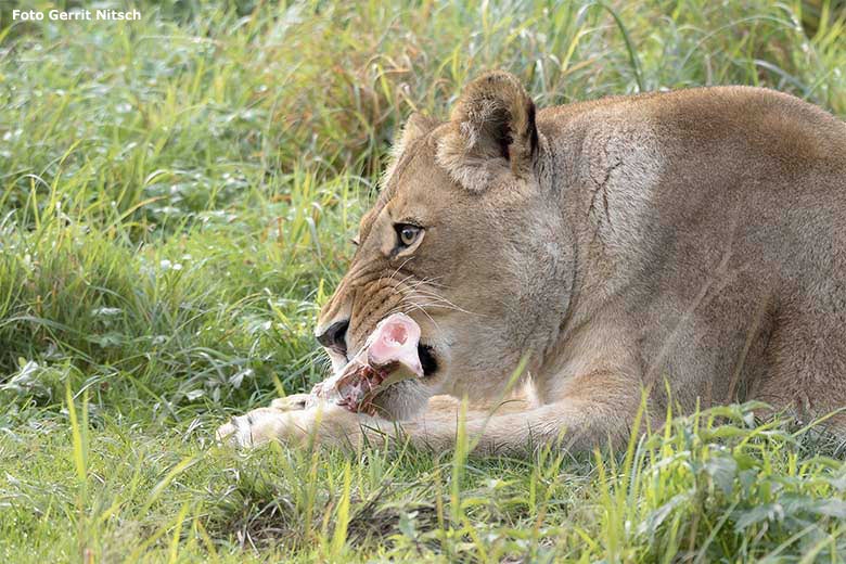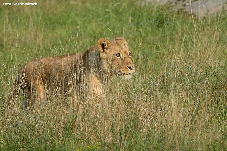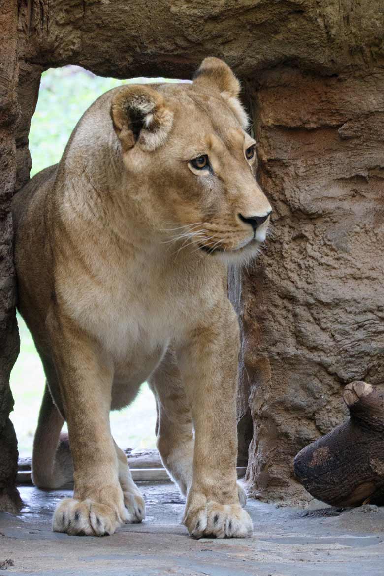 Afrikanische Löwin MAISHA am 27. September 2020 auf dem Weg zur Außenanlage im Grünen Zoo Wuppertal.