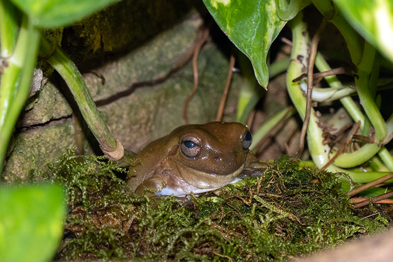 Mit etwas Glück können Zoobesucher/innen im Zoologischen Garten der Stadt Wuppertal in einem Schaugehege im Terrarium den Korallenfingerlaubfrosch frei auf einem Stein sitzend betrachten.