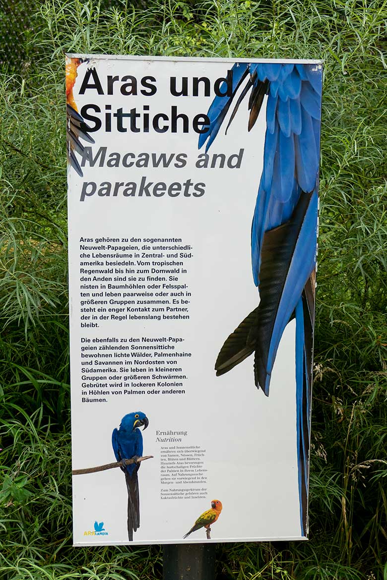 Alle zwölf Hyazinth-Aras zusammen können Zoogäste allenfalls im Innengehege der Aralandia-Voliere entdecken, weil nur elf dieser Hyazinth-Aras auf die Außenanlage der Aralandia-Freiflugvoliere gehen. Ein alter Hyazinth-Ara verbleibt freiwillig dauerhaft im Innengehege und geht nicht auf die Außenanlage der Aralandia-Voliere.