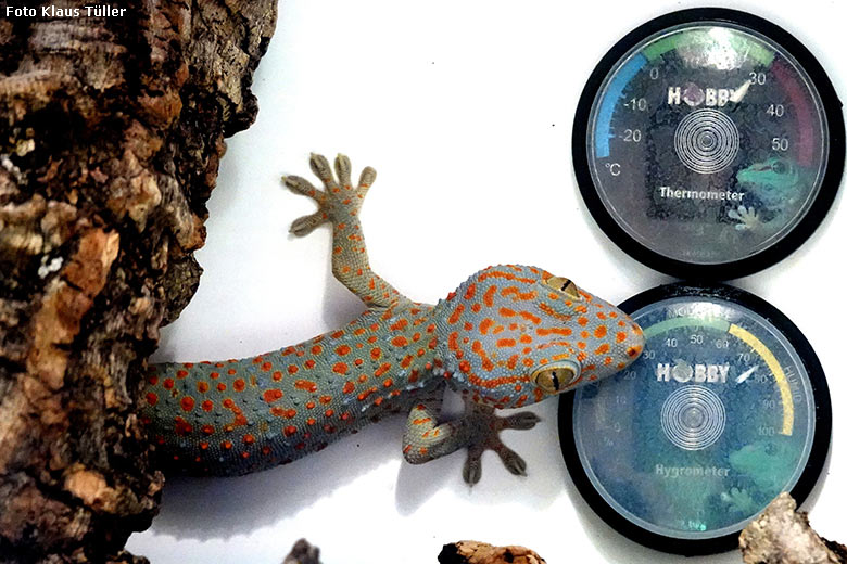Beim Besuch der Nachzuchtstation im Zoologischen Garten der Stadt Wuppertal entstand bei Zoogästen der Eindruck, als wenn ein Tokeh-Jungtier das Thermometer und das Hygrometer im Schaukasten kontrollieren würde.