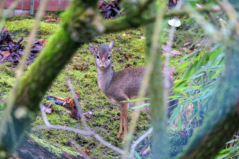 Weibliches Kirk-Dikdik am 12. Dezember 2021 auf der Außenanlage im Zoologischen Garten Wuppertal.