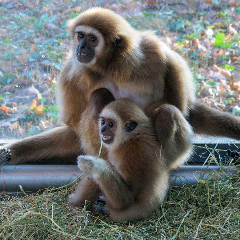 Weiblicher Weißhandgibbon FILOMENA mit Weißhandgibbon-Jungtier KHAO am 25. Oktober 2021 im Gibbon-Haus am Großen Teich im Grünen Zoo Wuppertal.
