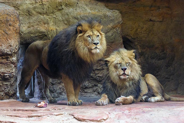 Afrikanischer Löwen-Kater Tamo und der verletzte Afrikanische Löwen-Kater MASSINO am 30. Januar 2022 im Löwen-Haus im Wuppertaler Zoo.