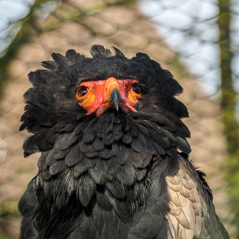 Männlicher Gaukler am 28. Januar 2022 in der rechten Außenvoliere am Greifvogel-Haus im Zoologischen Garten Wuppertal.