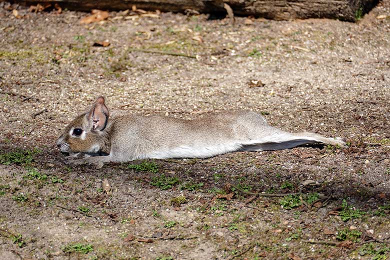 Am Mittwoch, dem 23. März 2023, streckte sich im Zoologischen Garten der Stadt Wuppertal ein Zwergmara auf dem Erdboden der Außenanlage am Südamerika-Haus lang aus und genoss für einige Momente die warmen Strahlen der Märzsonne.