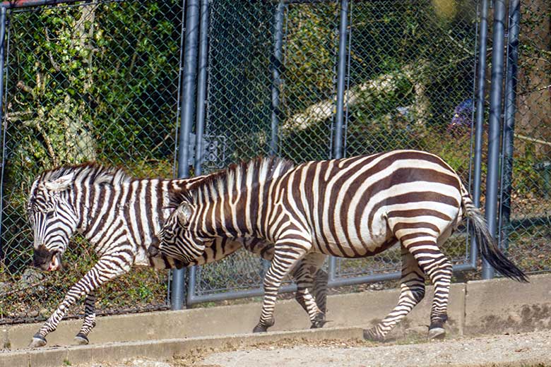 Böhmzebra-Stute CHARLOTT und Böhmzebra-Hengst SETH am 26. März 2022 auf der Afrika-Anlage im Wuppertaler Zoo.