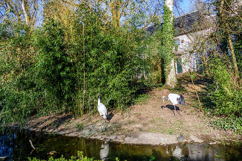 Mandschurenkranich-Paar nach dem Paarungs-Versuch am 26. März 2022 auf der Außenvoliere am Vogel-Haus im Zoo Wuppertal.