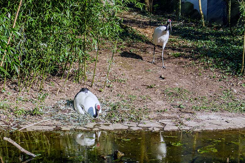 Vor einigen Tagen war vom Tierpflege-Team ein Strohnest auf der Außenanlage vorbereitet worden. Aber wie im Vorjahr bevorzugte das Mandschurenkranich-Paar einen Platz in der Nähe des Wassers, obwohl wuchernde und umgefallene Bambus-Pflanzen die Nutzung der gesamten Breite des Wasser-Ufers für die Kraniche im Frühjahr 2022 erheblich einschränken.