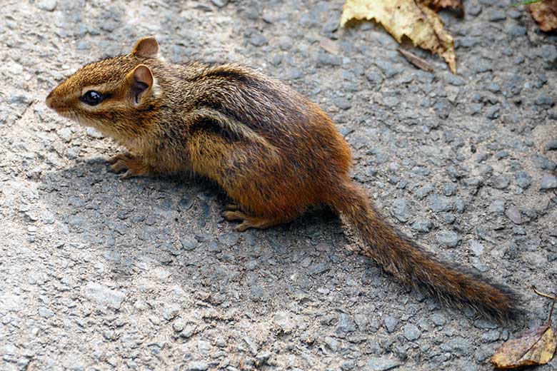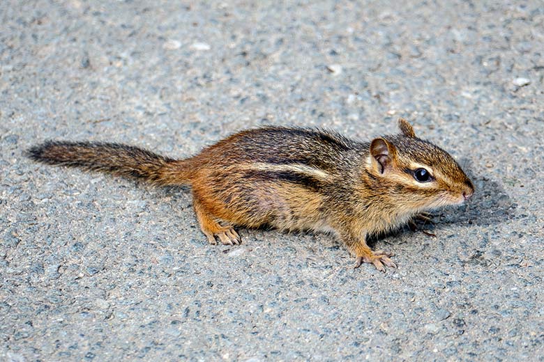 Streifenbackenhörnchen am 3. Juli 2022 auf dem Weg zur Löwen-Savanne im Grünen Zoo Wuppertal.