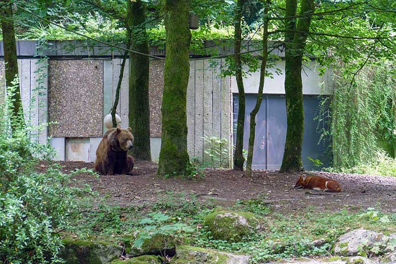 Braunbärin SIDDY und Asiatischer Rothund am 25. Juli 2022 auf der Außenanlage im Wuppertaler Zoo.
