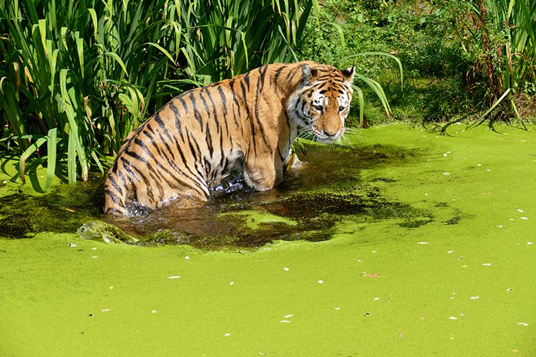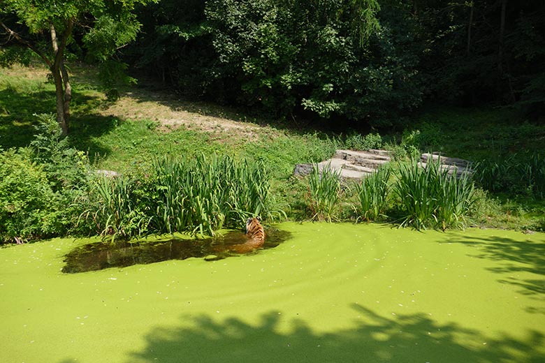 Nachmittags läuft der Amur-Tiger-Kater "Wassja" meistens andauernd über die größere Außenanlage im Tiger-Tal. Ab und zu geht die große Raubkatze dabei auch in das Wasser der Außenanlage, um bei den derzeitigen Sommer-Temperaturen Abkühlung zu suchen.