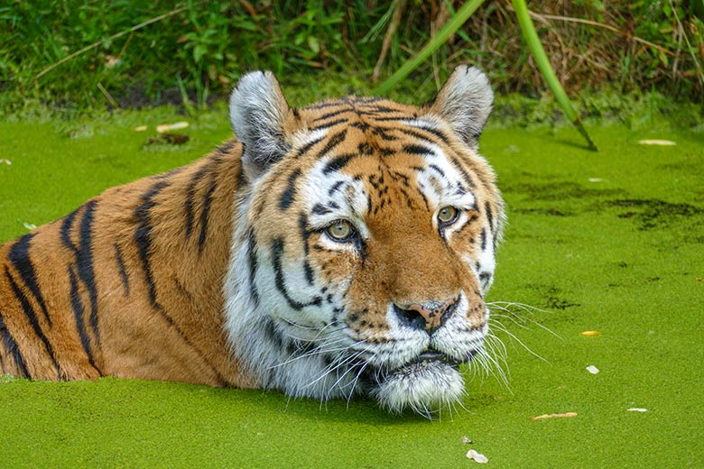Amur-Tiger-Kater WASSJA am 25. Juli 2022 auf der Außenanlage im Tiger-Tal im Wuppertaler Zoo.