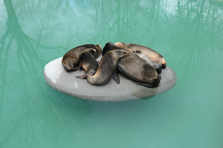Sechs Kalifornische Seelöwen am 14. März 2022 auf der kleinen Insel im Seelöwen-Becken im Grünen Zoo Wuppertal.