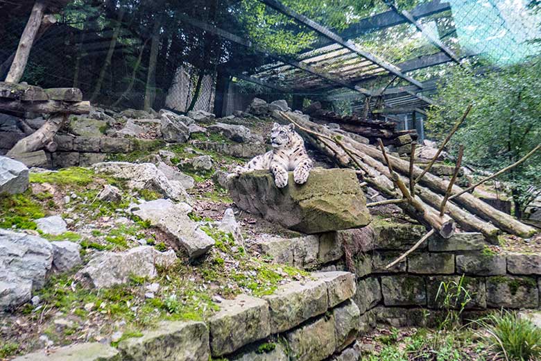 Am Freitagnachmittag, dem 23. September 2022, lag der Schneeleoparden-Kater "Irbis" im Zoologischen Garten der Stadt Wuppertal entspannt auf einem Stein in der Himalaya-Anlage und ließ sich von Zoogästen bewundern.