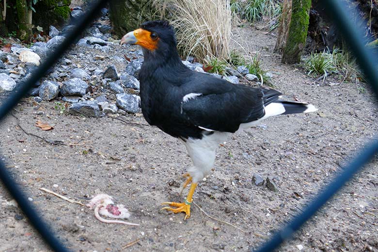 Berg-Karakara mit Futter-Maus am 26. Dezember 2022 in der Außenvoliere neben dem Kleinkatzen-Haus im Wuppertaler Zoo.