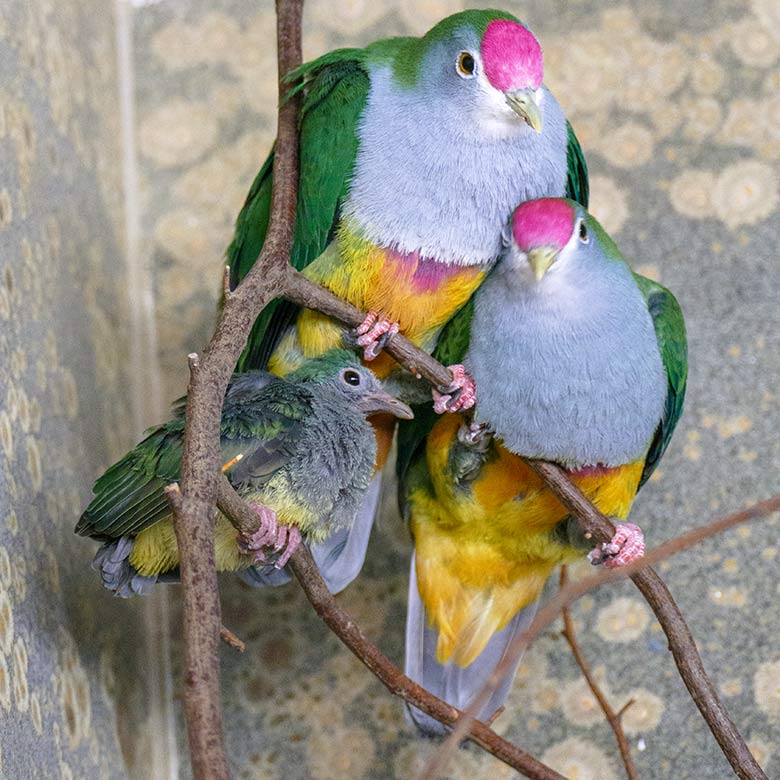 Rotkappen-Fruchttauben-Zucht-Paar mit Küken am 9. Dezember 2022 im Vogel-Haus im Grünen Zoo Wuppertal.
